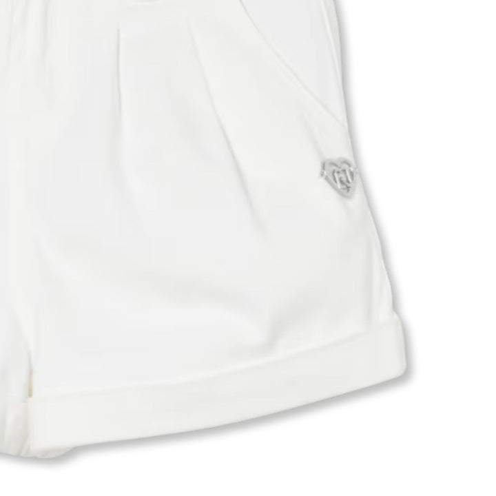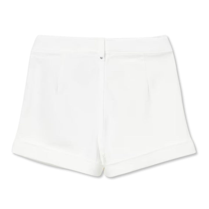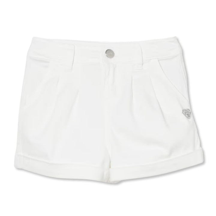 Stylish white girls shorts with rolled hems, front pleats, and a metallic logo detail perfect for a clean, chic summer look.