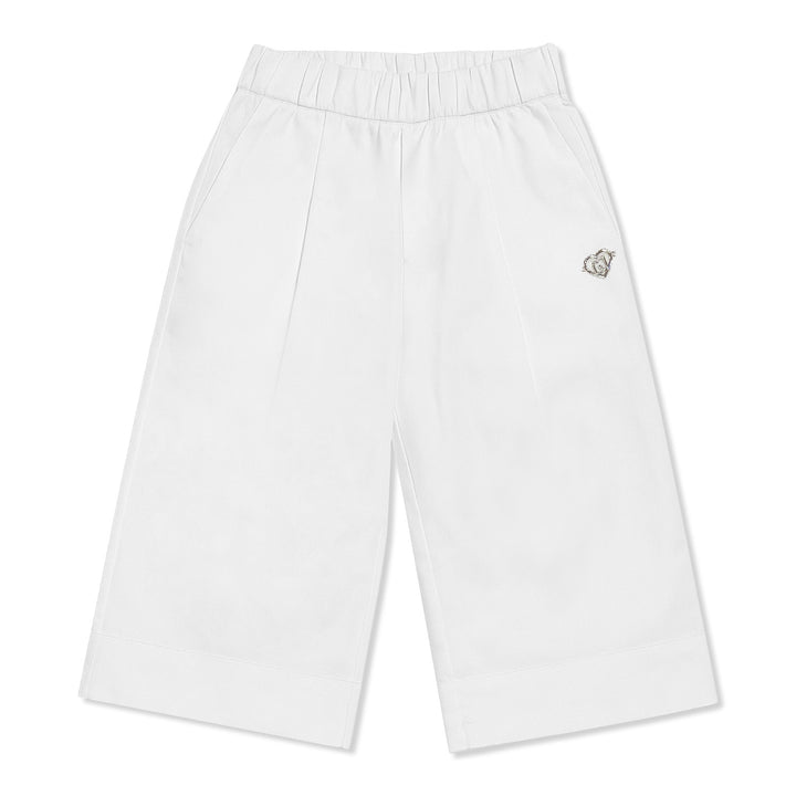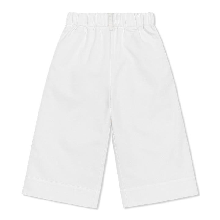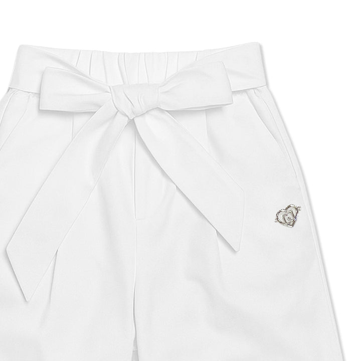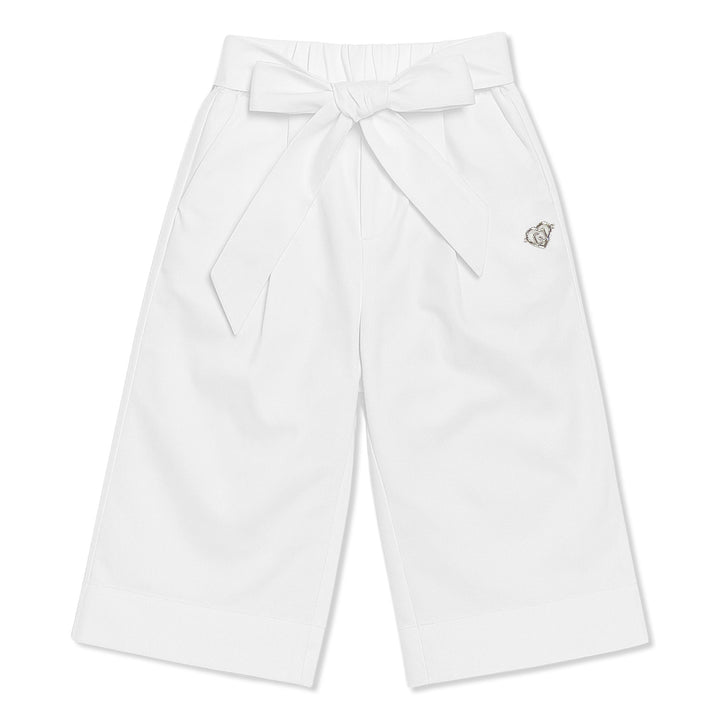Elegant white girls Trouser plazzo featuring front pleats, a tie-up waist belt, and a subtle metallic logo patch perfect for a polished, sophisticated look.