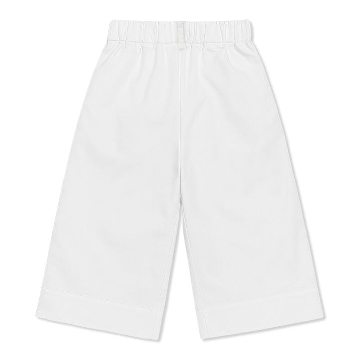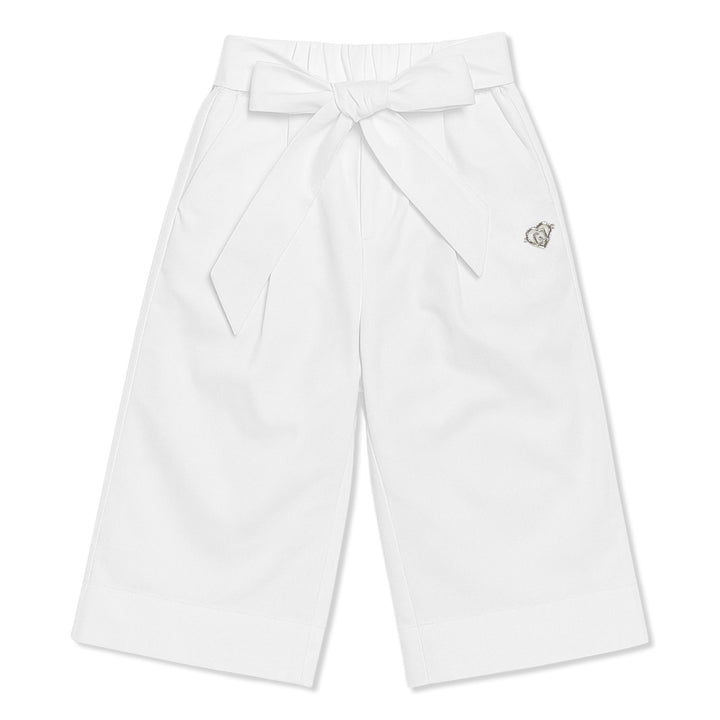 Elegant white girls Trouser plazzo featuring front pleats, a tie-up waist belt, and a subtle metallic logo patch perfect for a polished, sophisticated look.