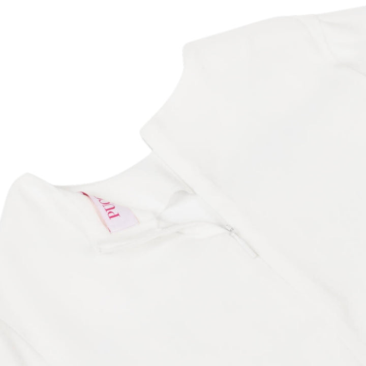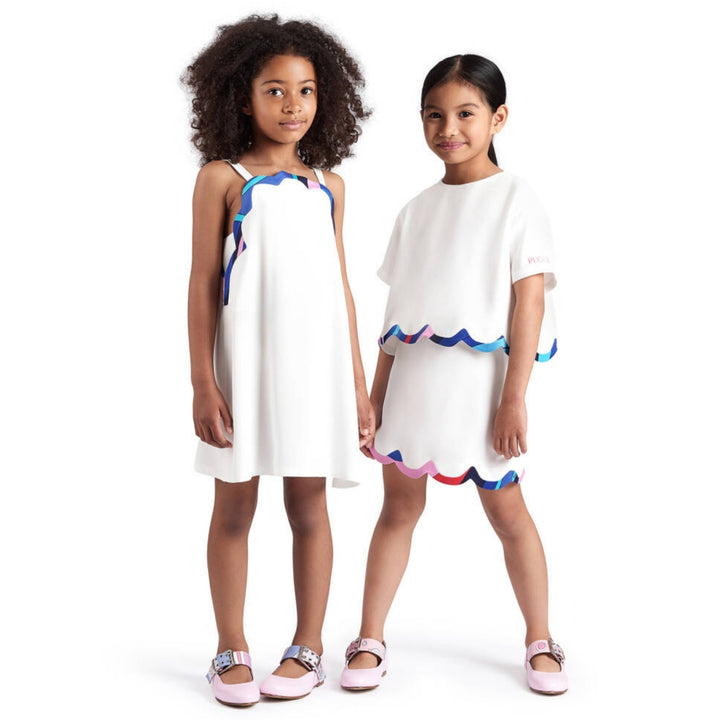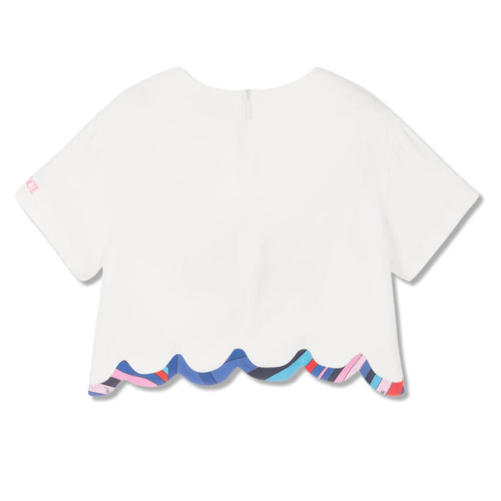 Off-white top for girls by Italian designer PUCCI, woven in lightweight viscose crepe with a beautiful, soft drape. This boxy style top has a scalloped hem in the bold pink and blue Iride print. The brands name is embroidered on the sleeve in pink fo