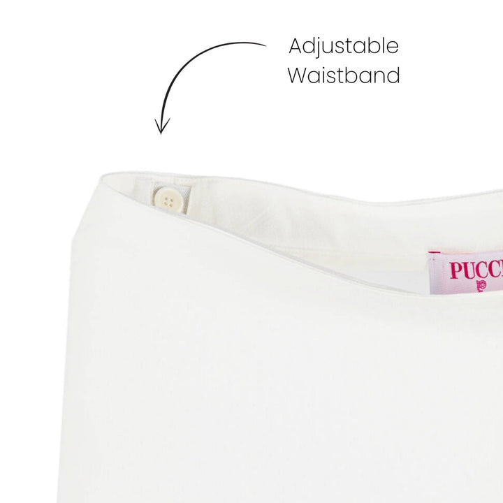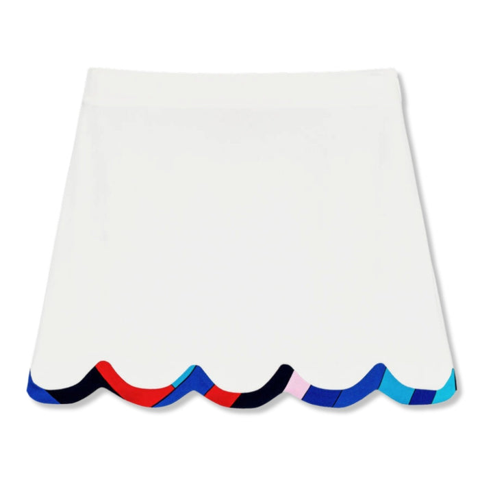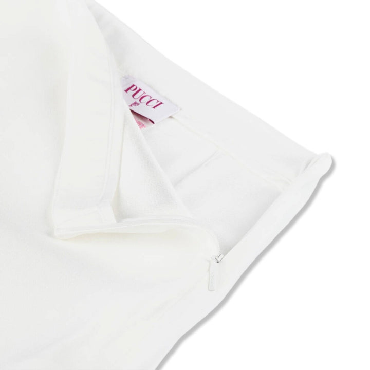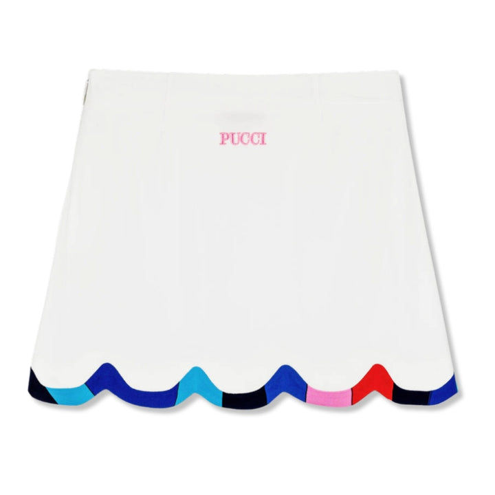 Off-white skirt for girls by luxury designer PUCCI, woven in a lightweight viscose blend. This stylish piece has a pretty scalloped hem, decorated with the brand signature blue and pink Iride print. Lined for comfort, there is a discreet side zip and pink logo embroidery on the back.