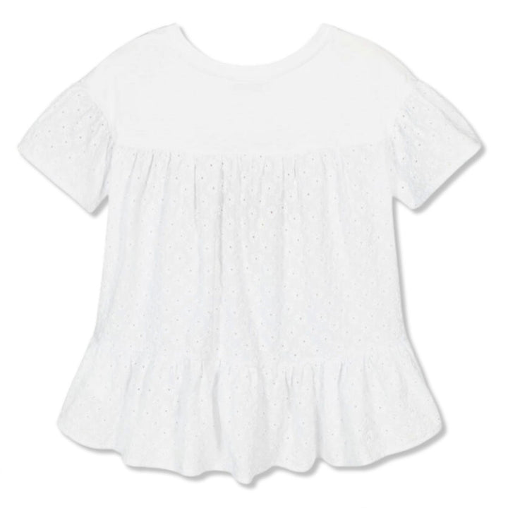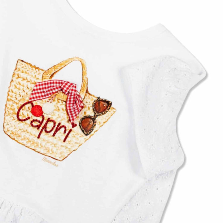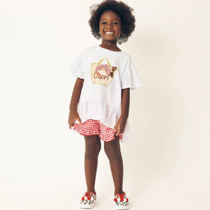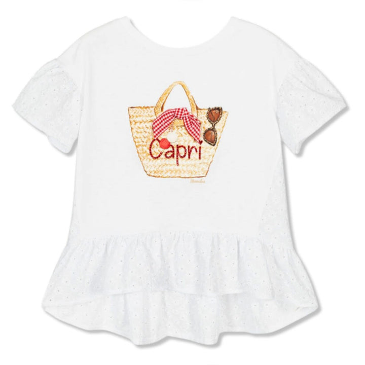 Pretty white cotton top for girls by Monnalisa, made in lightweight broderie anglaise with a soft jersey panel on the front. Styled with a dipped ruffle hem, it has a stylish basket bag print with a red gingham bow. 'Capri' lettering is covered in sp