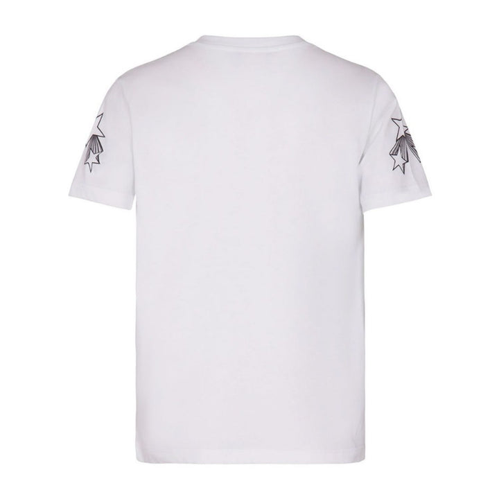 White t-shirt for girls Italian brand MSGM. Made from soft cotton jersey. It has silver logo on the chest and stars print on the front and sleeves.