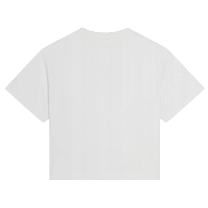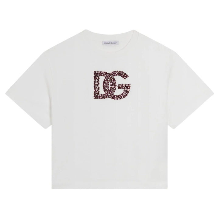 Elevate your child's casual wardrobe with this classic white T-shirt from Dolce & Gabbana Kids. Made in Italy from soft 100% cotton, this piece features a timeless crew neck, short sleeves, and a straight hem for a relaxed fit. The standout detail is the subtle yet stylish logo embellishment, adding a signature designer touch to a wardrobe essential.