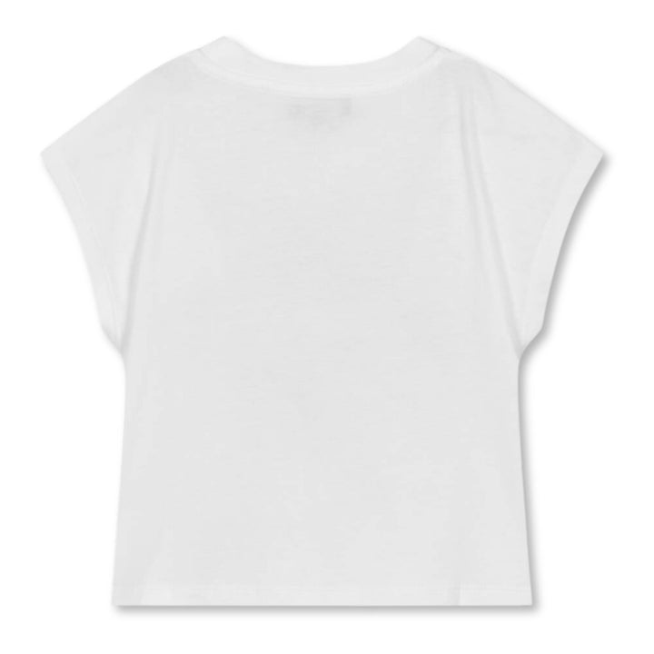 Mini-me white short-sleeved T-shirt for girls by DKNY, made in a soft organic cotton and viscose blend jersey. In a modern boxy fit, this casual tee has a distinctive blue, orange and yellow logo print on the front, with a cool stretched effect.