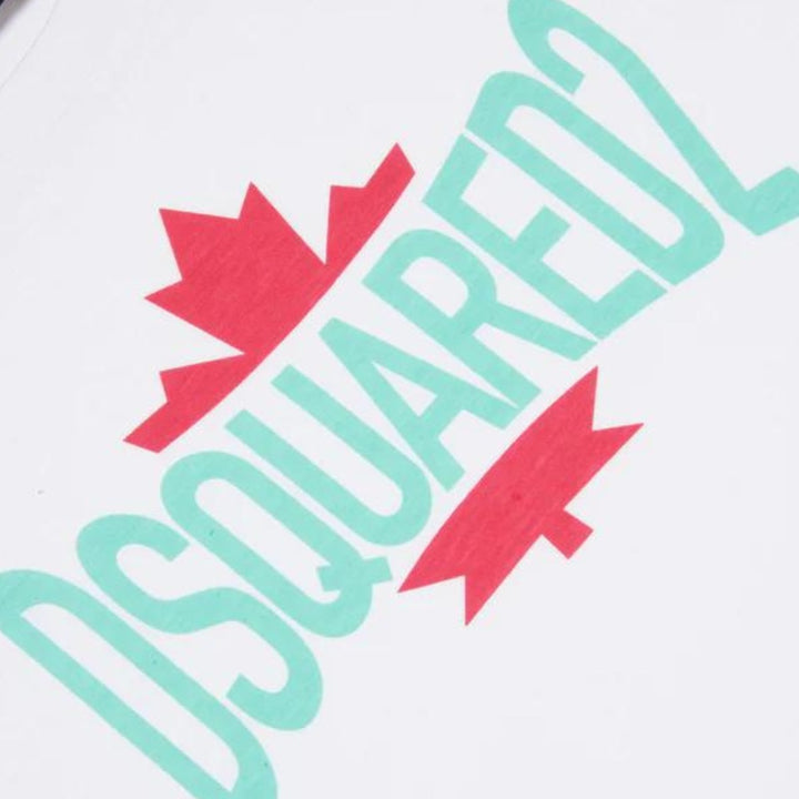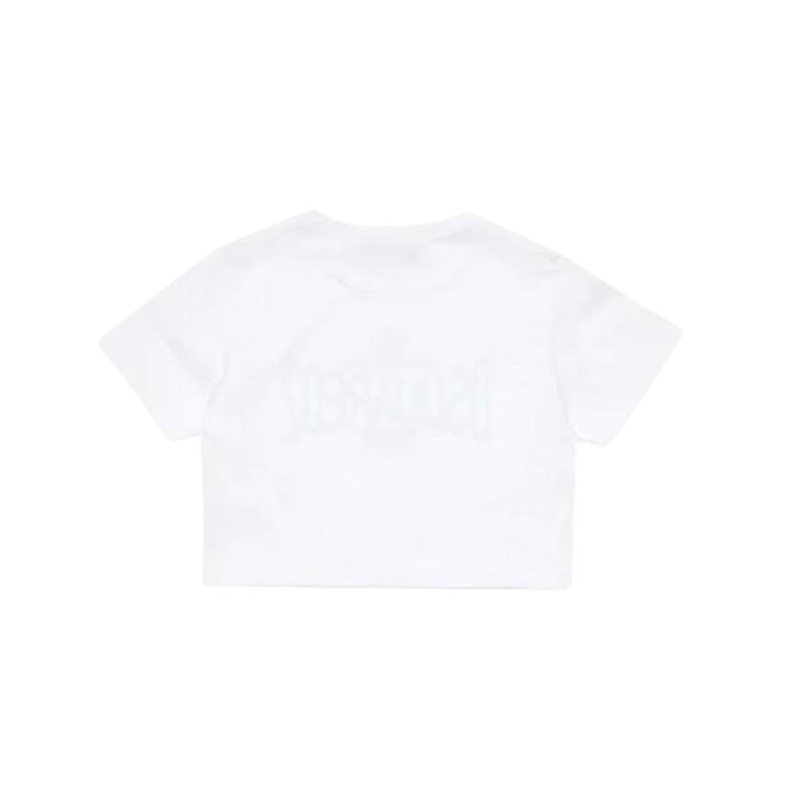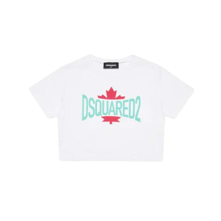 Cropped crew-neck T-shirt in short-sleeved jersey. Featuring a Dsquared2 logo with contrasting color leaf graphic on the front. Made of 1% cotton. An ideal garment for extremely feminine casual looks.