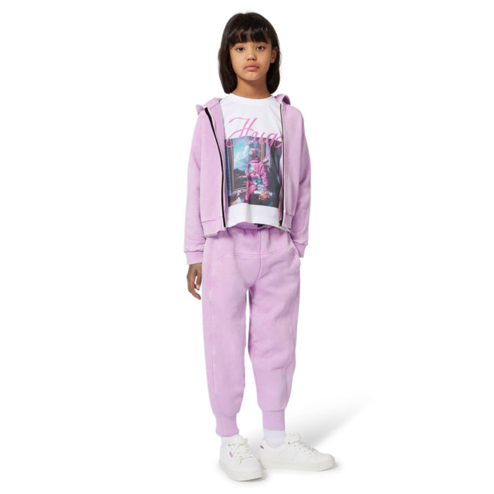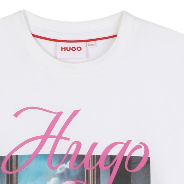 Girls white logo-print T-shirt by HUGO crafted from soft cotton, featuring the brand’s bold red logo across the chest for a sleek, modern look.