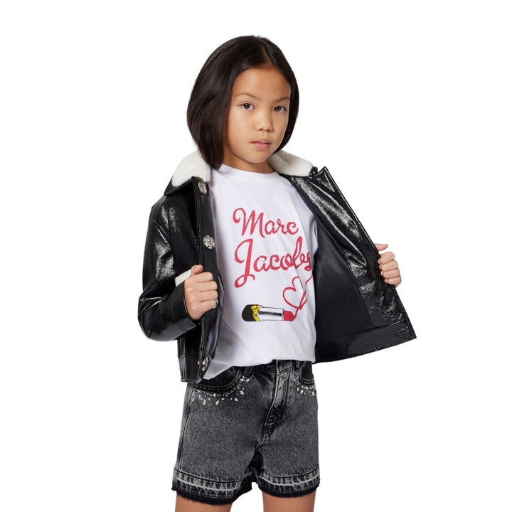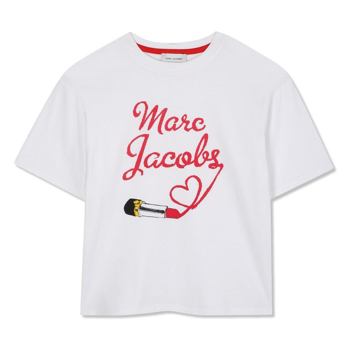 A stylish white T-shirt featuring a bold logo print, crafted from soft 100% cotton for everyday comfort and breathability. Ideal for casual wear and layering Marc Jacobs.