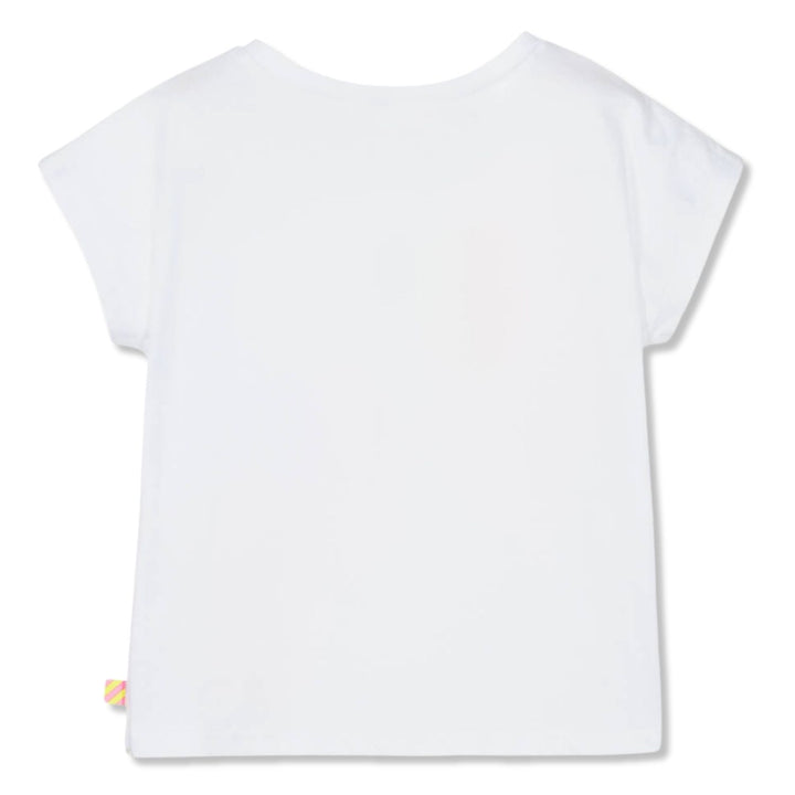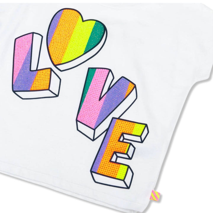 Girls white T-shirt by Billieblush, made from soft and lightweight cotton jersey. It has a bold 'LOVE' graphic print on the front, striped in vibrant shades of pink, orange and yellow. The letters are topped with small iridescent diamantes for a shim