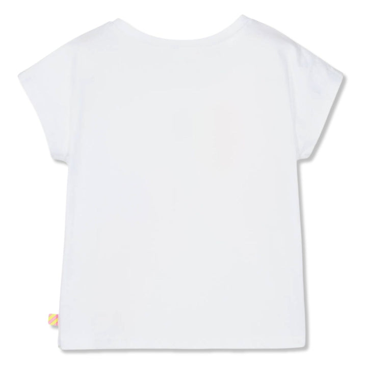 Girls white T-shirt by Billieblush, made from soft and lightweight cotton jersey. It has a bold 'LOVE' graphic print on the front, striped in vibrant shades of pink, orange and yellow. The letters are topped with small iridescent diamantes for a shimmering finish.