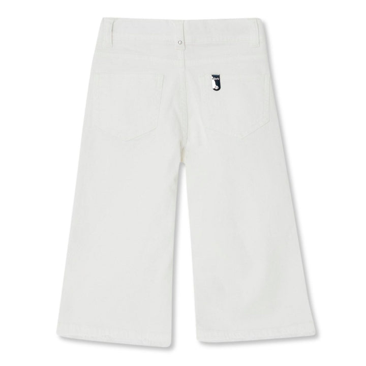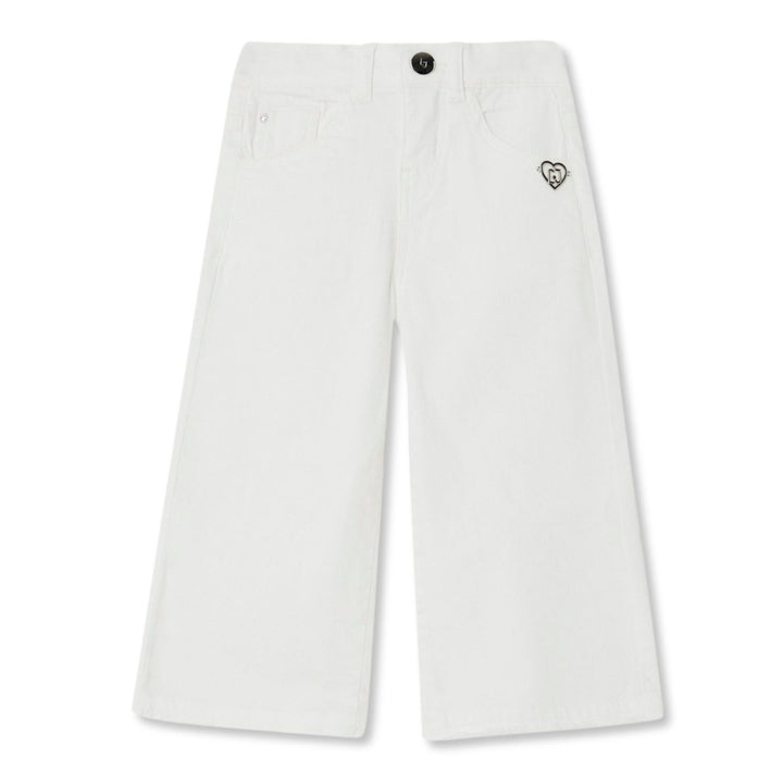 Stretch cotton blend trousers, high-waisted, with flared leg, five-pocket model, with button and hidden zip fastening and metal heart with L J logo on the side. For a trendy and casual look