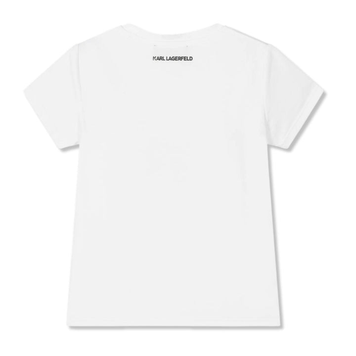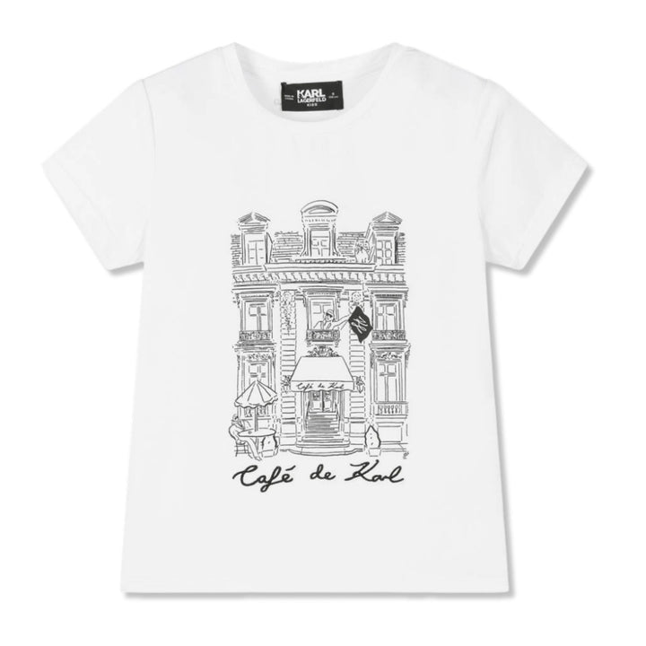 Mini-me white T-shirt for girls by KARL LAGERFELD KIDS, made in a soft, lightweight organic cotton-blend jersey. Cool and comfortable, it features a black cafe-themed design on the front with Karl and Choupette characters. Cafe de Karl is embroidered under the design in black and there is a small black logo printed on the back for a subtle branded finish.