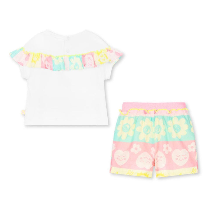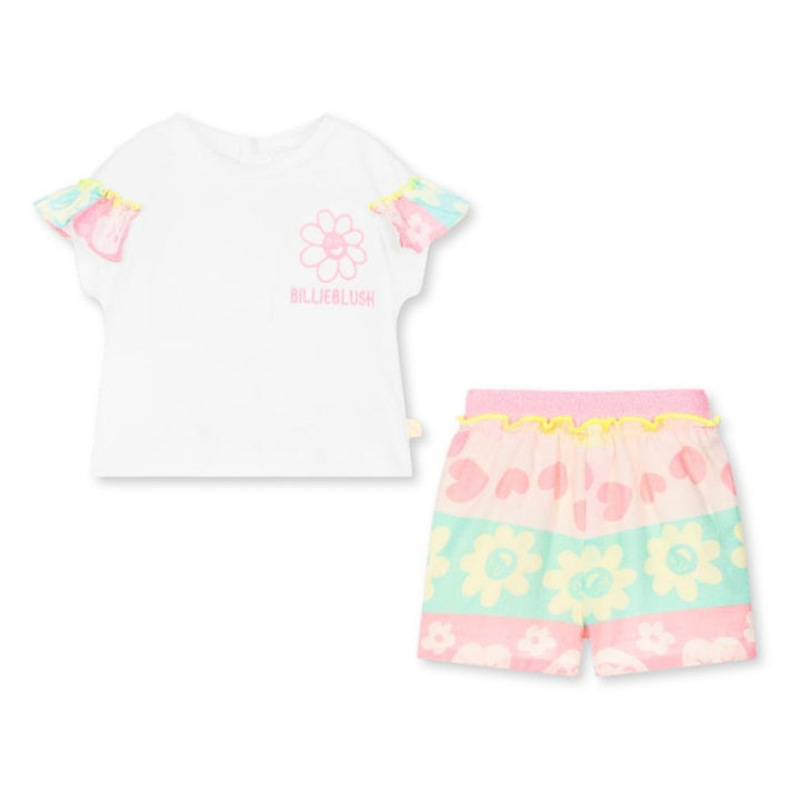 Cute white and pink shorts set for little girls by Billieblush, made in soft cotton jersey. The white T-shirt has a neon pink floral motif embroidered on the front and colourful flutters on the sleeves. It fastens with simple poppers on the back for