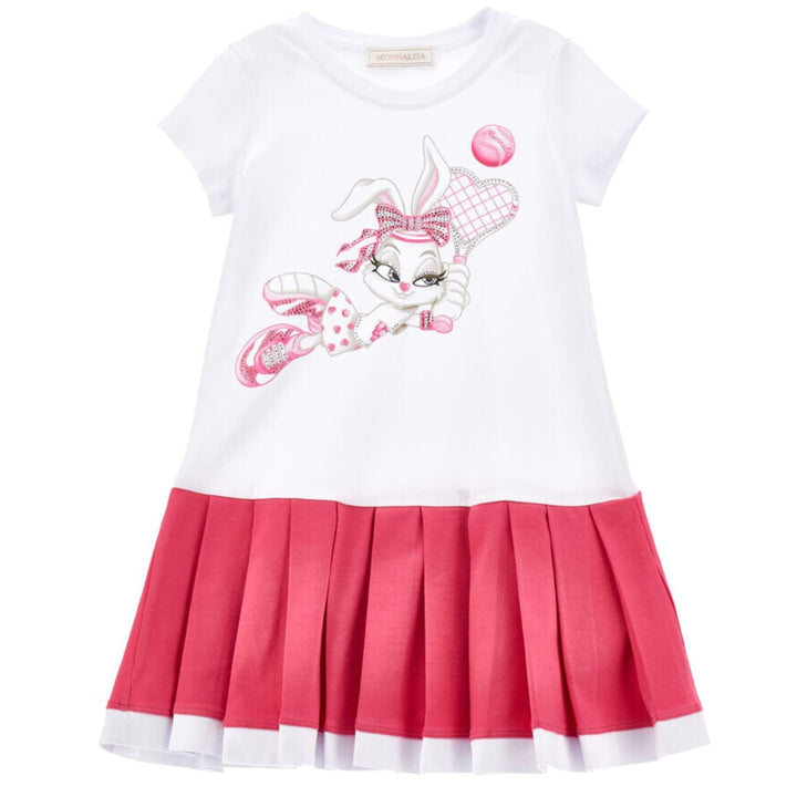 Bright and playful, this white and fuchsia pink dress from Monnalisa features a fun cartoon print, crystal embellishments, and a pleated skirt. Made from a soft cotton-blend jersey, its designed with a color-block panel, short sleeves, and a comfortable pull-on styleperfect for stylish everyday wear.
