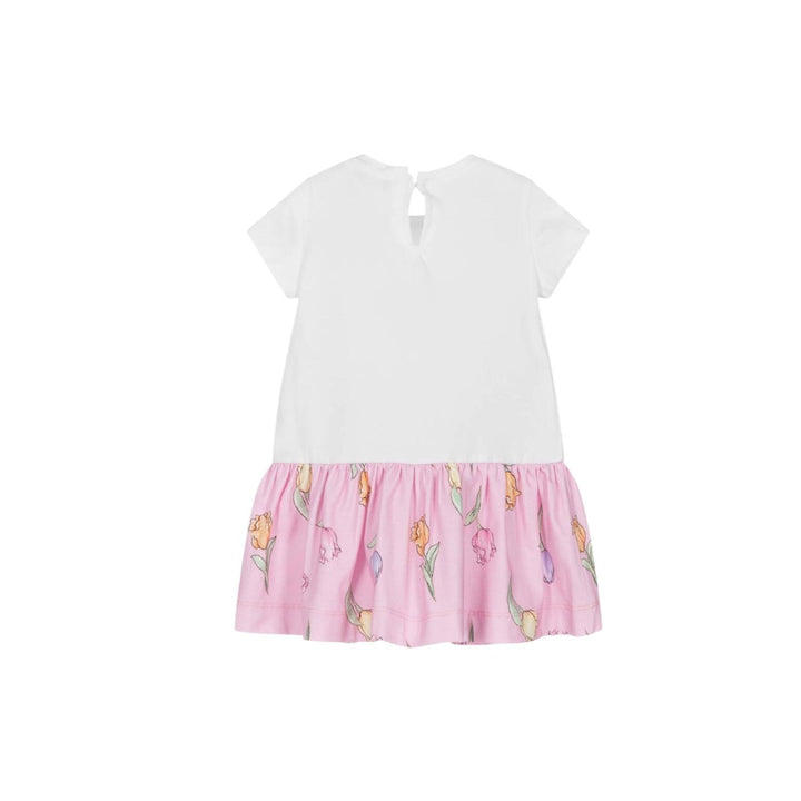 A sweet, white and pink dress for little girls by Monnalisa, made in soft cotton jersey. The front has a pink and green tulip print with a subtle logo and is embellished with diamantes for a touch of sparkle. The cute pink peplum skirt is patterned w