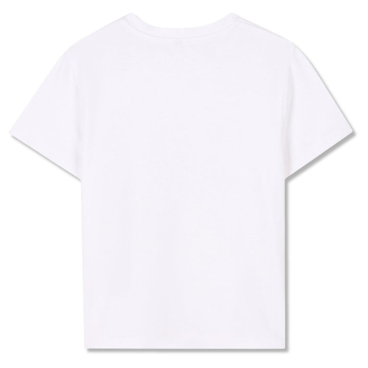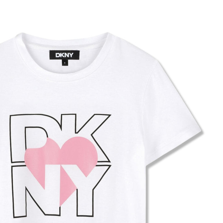 Inspired by the adult collection, this casual white T-shirt for girls is by DKNY. Made in comfortable viscose jersey, it has the brand's Heart of NY logo on the front in black and pale pink.