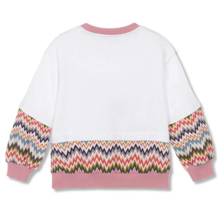 Add a pop of pattern to her casualwear with this girls white and pink zig-zag sweatshirt from Missoni. Featuring the brands iconic zig-zag motif in soft pastel tones, this sweatshirt is crafted from premium cotton for warmth and comfort. Finished with ribbed trims and a relaxed fit, its perfect for layering on cooler days with a signature designer touch.