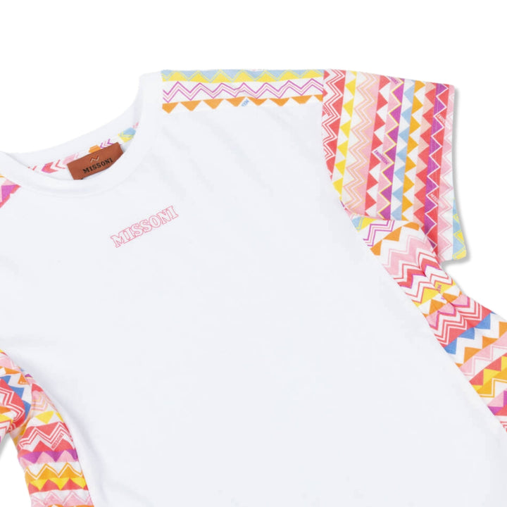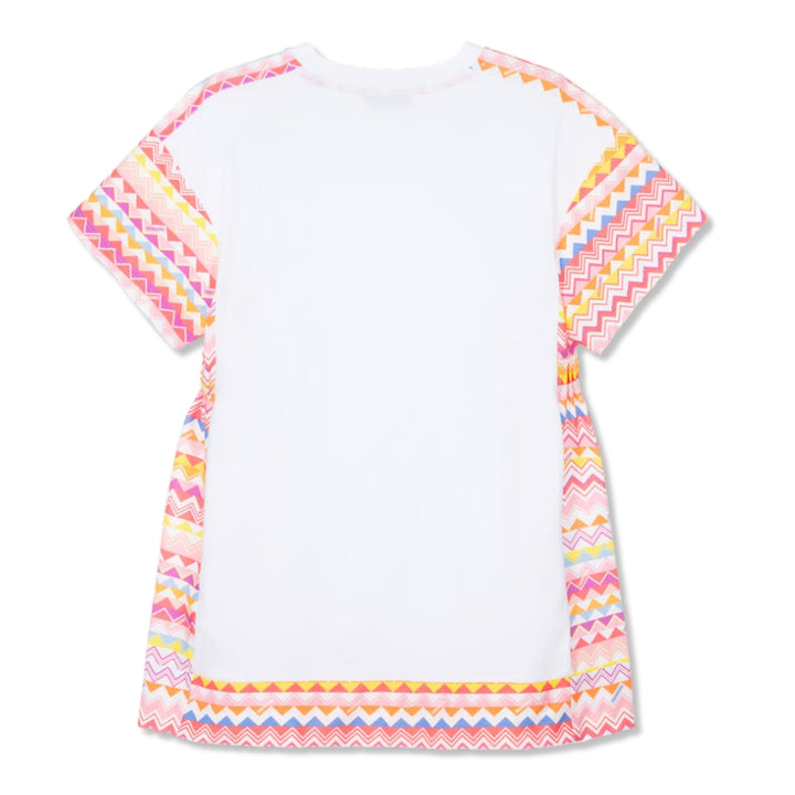 White cotton jersey dress for girls by Missoni, made with organic cotton. Soft and comfortable, this casual T-shirt style is trimmed with the luxury Italian designer's signature zigzag pattern in shades of pink, with purple, blue and yellow accents.