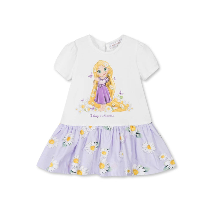 White and lilac purple cotton dress for little girls by Monnalisa. So lovely and full of character, it has Disney's Princess Rapunzel on the soft jersey bodice, with sweet daisies and butterflies within her famous long, blonde hair. This A-line dress
