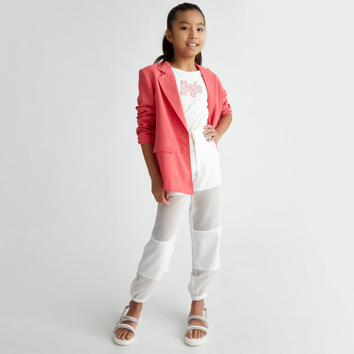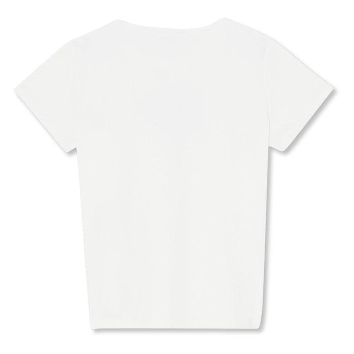 With short sleeves and a crew neck, it's comfortable and cool for any occasion. The Red rhinestone logo on the front adds a touch of sparkle and glamour. Show off your style in this white tee, perfect for any little fashionista!