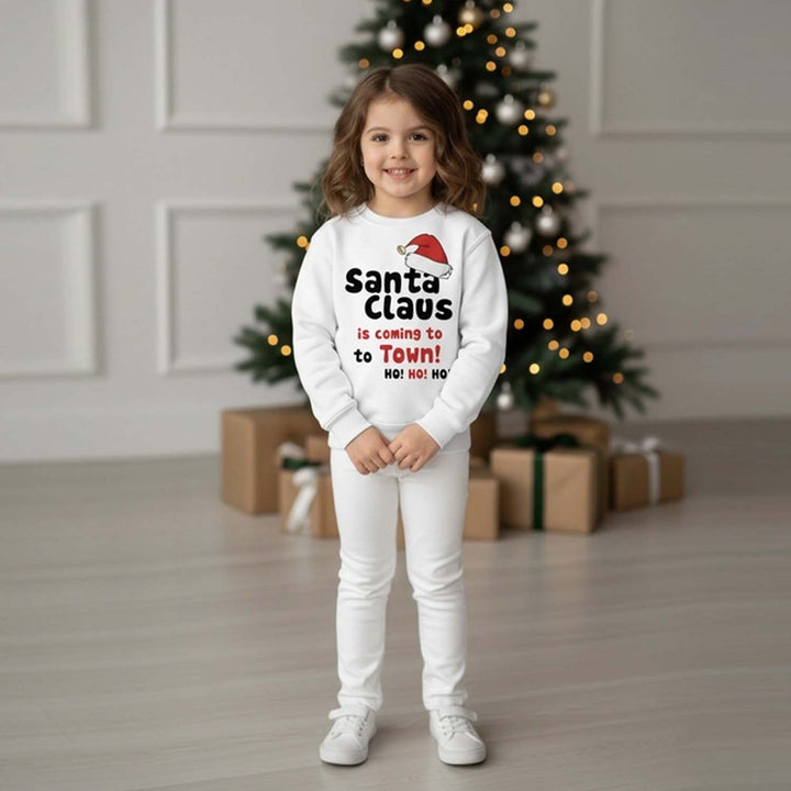 Girls White Santa Claus In Town Typography Sweatshirt brings festive charm with its playful Christmas-themed text and cozy design. Made from soft, comfortable fabric, it is perfect for keeping warm during the holiday season while adding a fun and cheerful touch to her winter wardrobe.