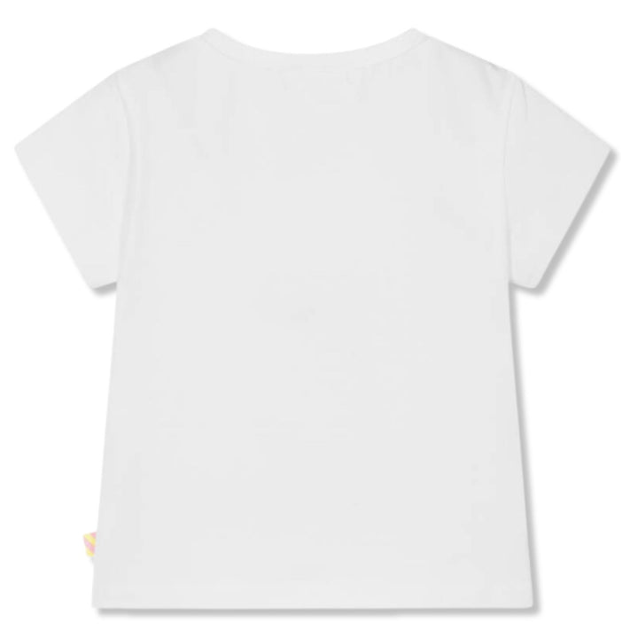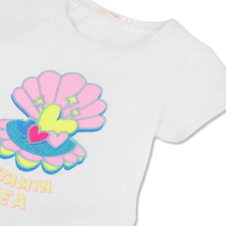 White cotton T-shirt for girls by Billieblush, made in soft and stretchy jersey. Designed with a fun, 'Vitamin Sea' theme, it features a pink and neon yellow shell print with shiny blue sequins and glittery accents.