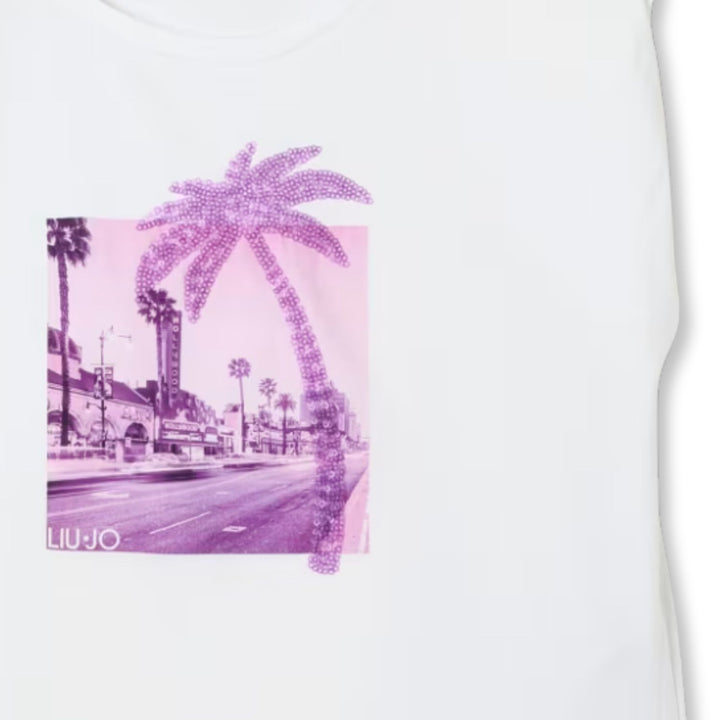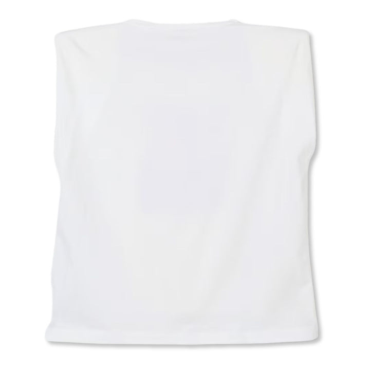 A casual-sporty sleeveless cotton top designed with a bold crewneck and padded shoulders for a structured, athletic silhouette. Featuring an all-over logo print with contrasting graphics and eye-catching rhinestone details, this top blends streetwear