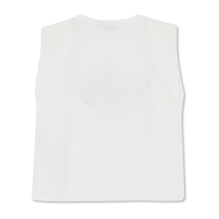 A casual-sporty sleeveless cotton top featuring a bold crewneck design with padded shoulders for a structured silhouette. Adorned with an all-over logo pattern and a contrasting graphic, it's elevated by subtle rhinestone detailing that adds a stylish edge. Finished with a straight hemline for a clean, athletic-inspired look.