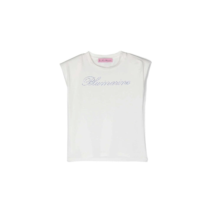 Girls logo print t-shirt from MISS BLUMARINE featuring white, stretch-cotton, gem-logo detailing, crew neck, cap sleeves and straight hem.