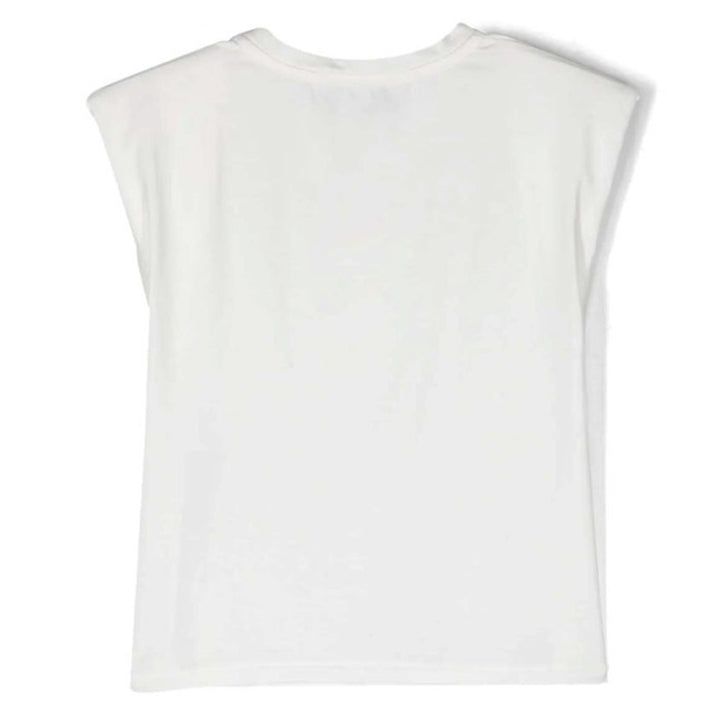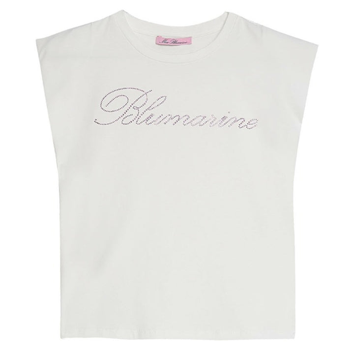 T-shirt With Logo from Miss Blumarine - White Miss Blumarine cotton t-shirt for girl - Crew neckline - Sleeveless - Padded shoulders - Front contrasting color logo with strass