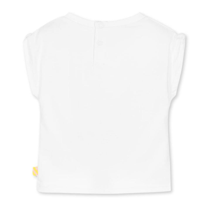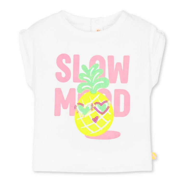Sleeveless white T-shirt for little girls by Billieblush, made in soft organic cotton jersey. Fastening easily with poppers on the back of the neck, it has a fun pineapple print on the front with neon colours and eye-catching sparkles.