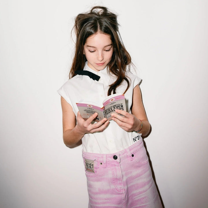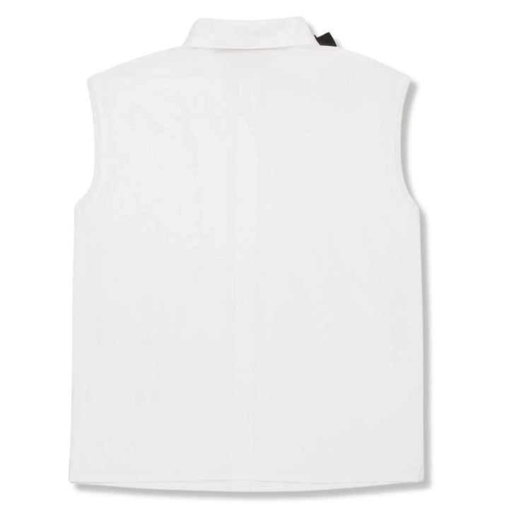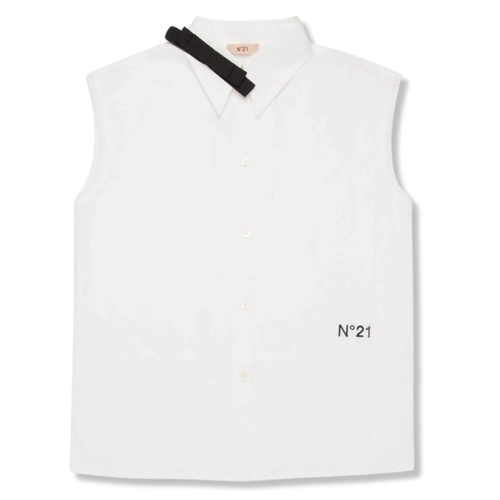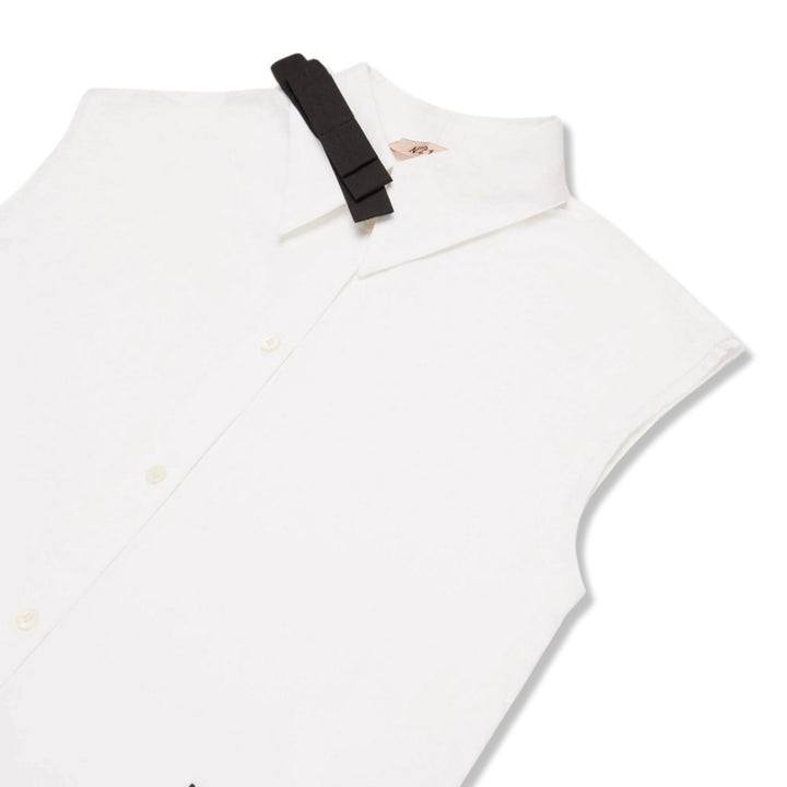 This is a white sleeveless button-up shirt with a minimalist yet sophisticated design. It features a classic pointed collar and a concealed button placket for a clean look. A distinctive detail is the black fabric ribbon attached near the collar, adding a unique contrast and modern touch. The N21 logo is printed in black on the lower right side, providing subtle branding. The straight-cut silhouette gives it a relaxed yet polished fit, making it versatile for both casual and semi-formal occasions.