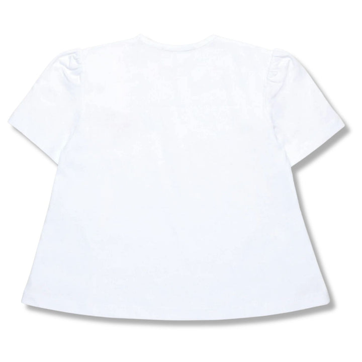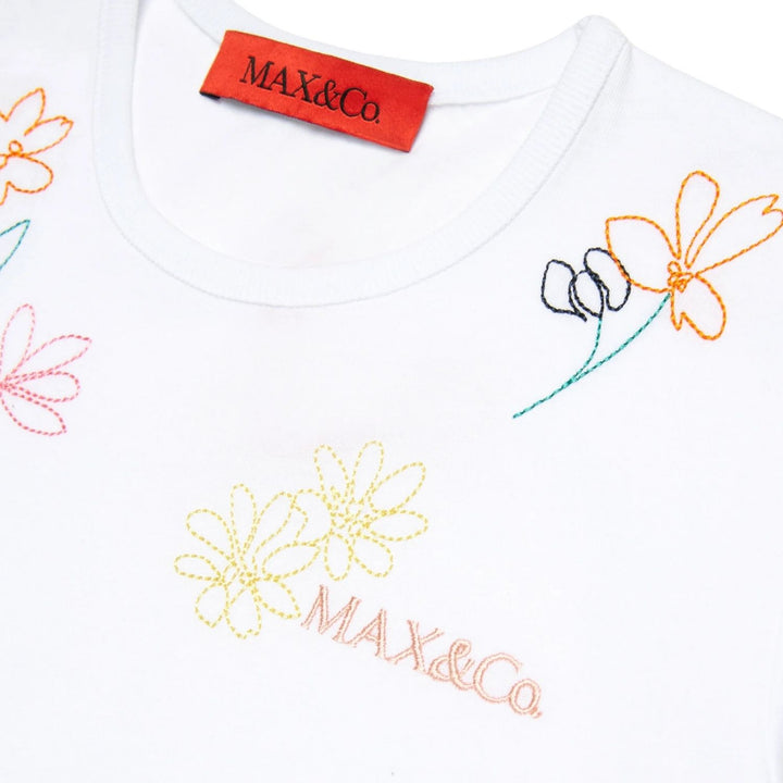 Girls white cotton jersey T-shirt with balloon sleeves. Crew-neck surrounded by floral embroidery on the front. Embroidered MAX&Co. logo in contrasting colour on the front on the heart side.