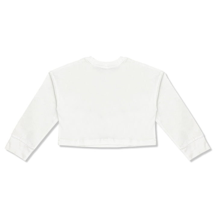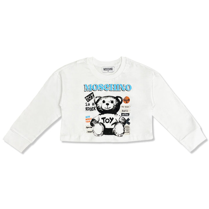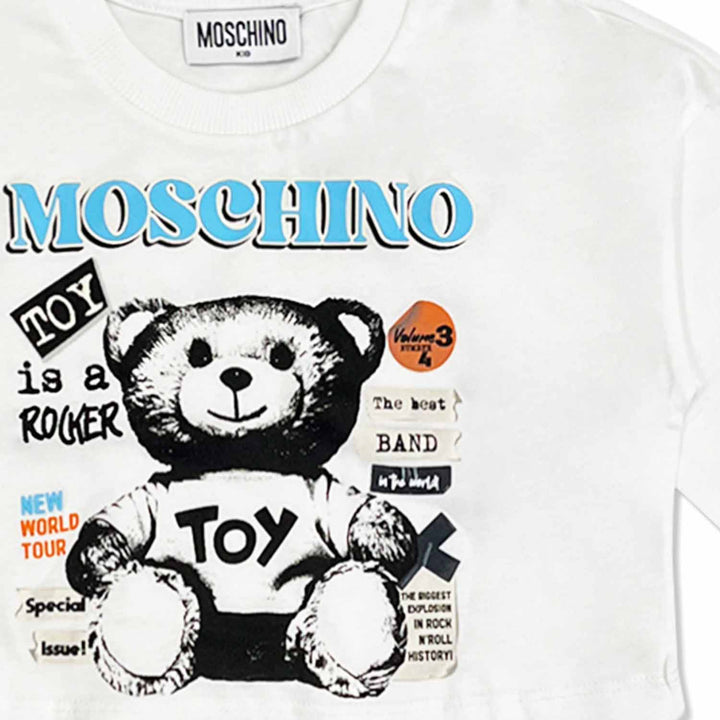 A cool white cotton crop T-shirt for girls by Moschino Kid-Teen. For a distinctive look, it features a black and white print of the Italian designer's signature Teddy Bear, with a blue logo in a rock magazine-inspired design. Made in soft and comfort