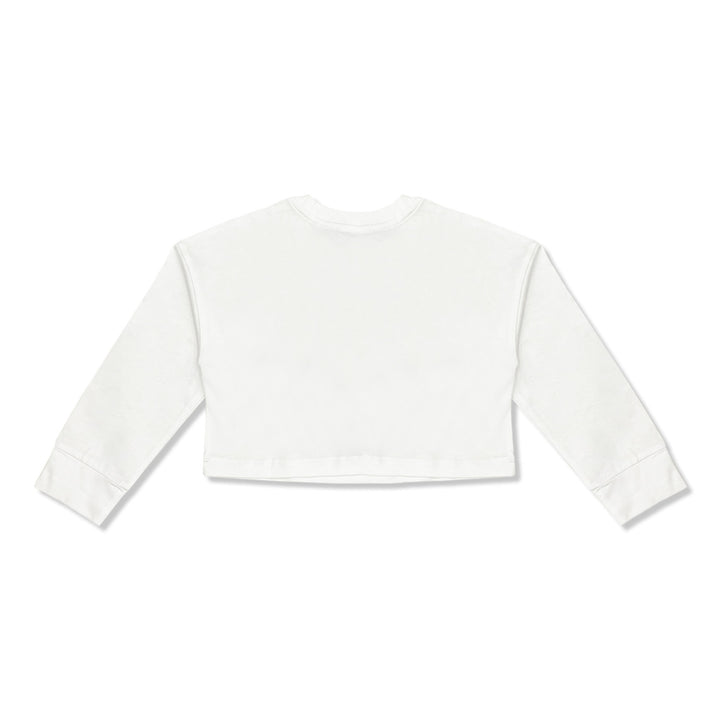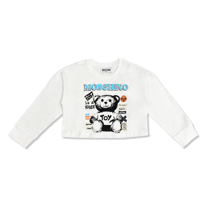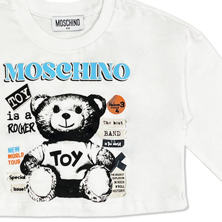 A cool white cotton crop T-shirt for girls by Moschino Kid-Teen. For a distinctive look, it features a black and white print of the Italian designer's signature Teddy Bear, with a blue logo in a rock magazine-inspired design. Made in soft and comfortable jersey, this classic casual tee has a ribbed crew neck and full sleeves.