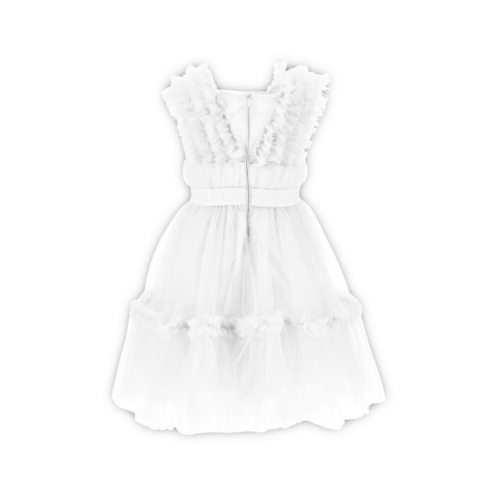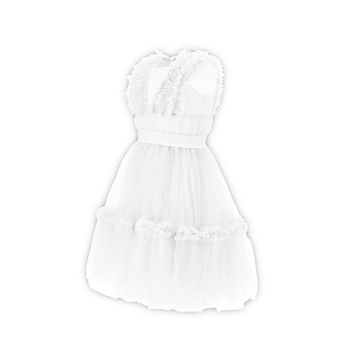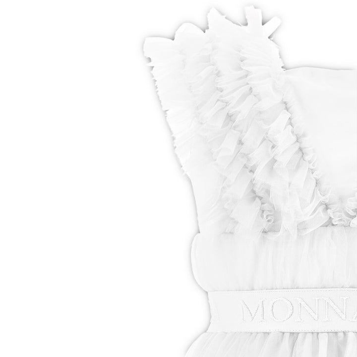 In a stunning shade white, this special occasion dress for girls is designed by Italian brand, Monnalisa. Crafted in beautifully soft layers of fine tulle, it has a fitted bodice with luxurious, statement ruffles. Around the waist is a jacquard logo