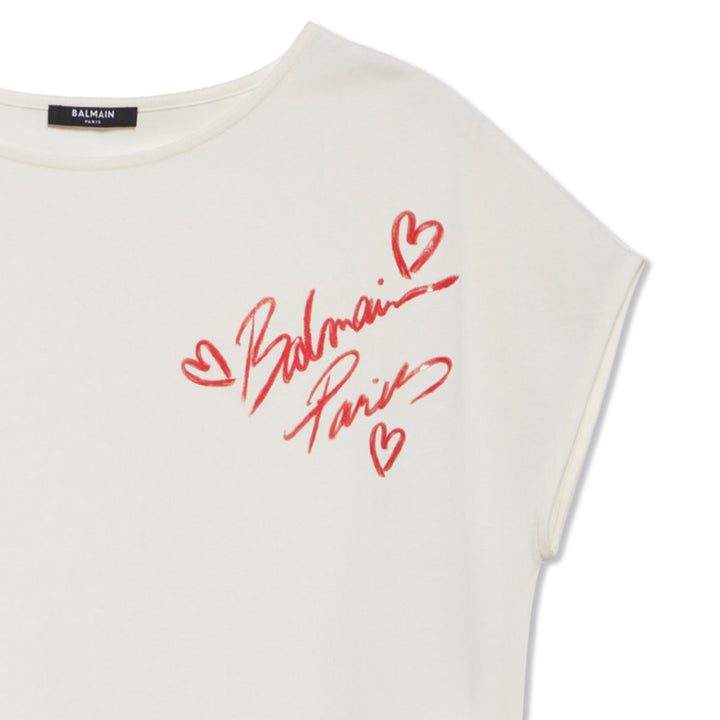 This white short-sleeve t-shirt by Balmain Paris features the iconic brand's script logo and heart motifs in striking red across the chest. Made from soft, premium cotton, it offers a comfortable regular fit, combining everyday versatility with Balma