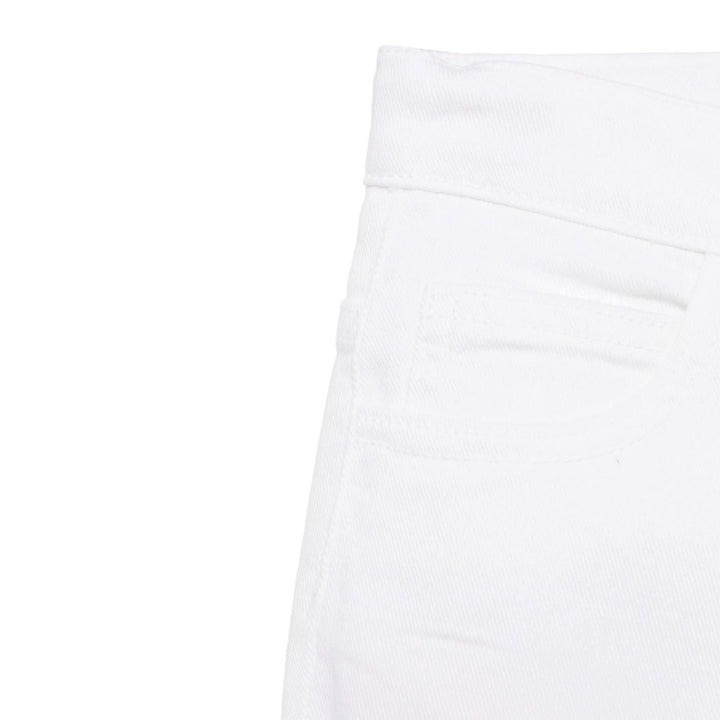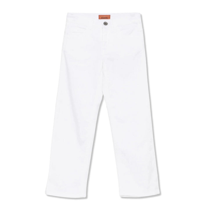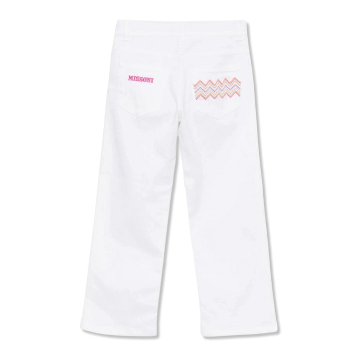 These Missoni wide-leg jeans offer a stylish and minimalistic design with a fresh white color. The back pockets feature the iconic Missoni logo and a signature zigzag pattern in pastel hues, adding a touch of brand identity.