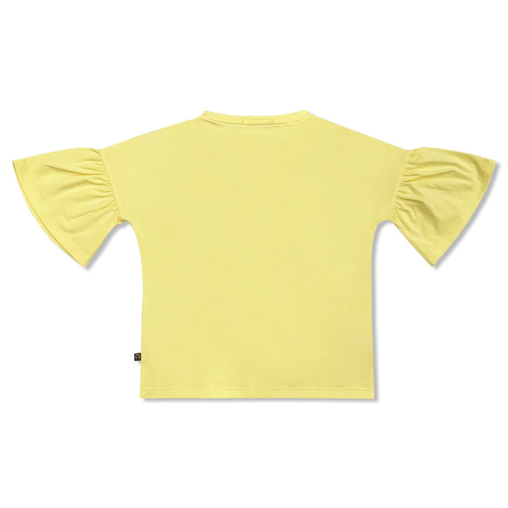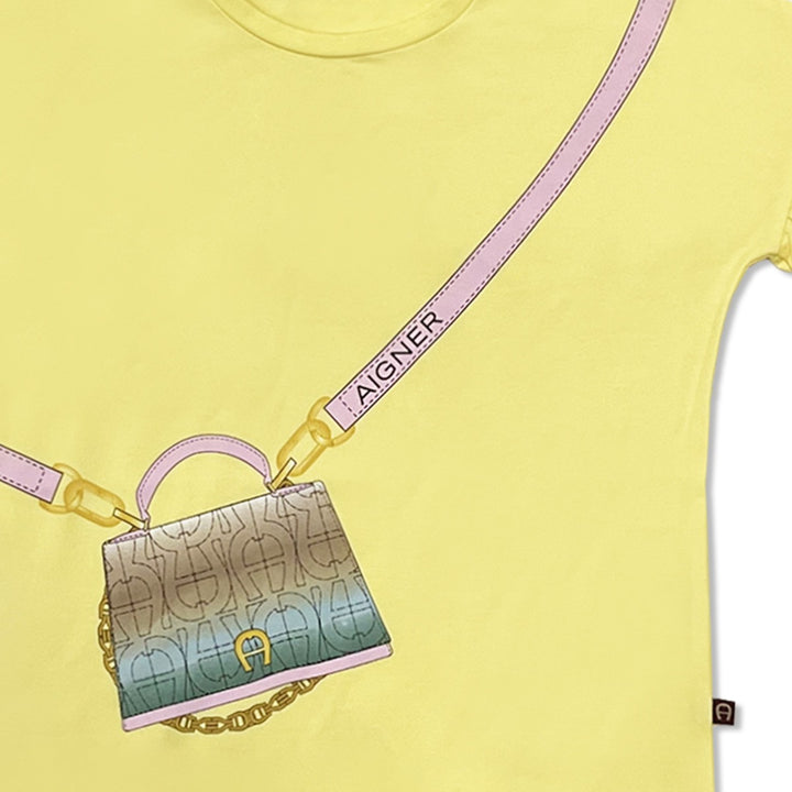 Yellow cotton T-shirt for girls by German brand AIGNER, with a crossbody bag patterned in the signature 'A' horseshoe logo printed on the front in beige and pink. Endlessly comfortable, it is made in beautifully soft jersey, with dropped shoulders an