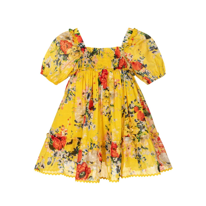 Stunning bright yellow cotton dress for girls by luxury Australian brand Zimmermann, patterned with vibrant red and blue florals. Delicately soft and very lightweight, it has a pretty trapeze silhouette with ruffle trims and shirred panels on the fro