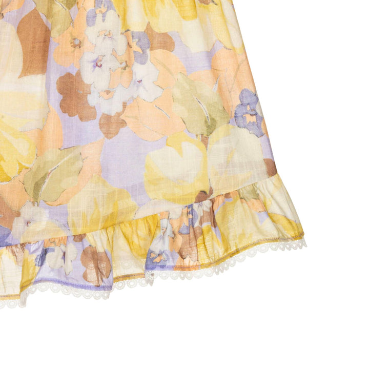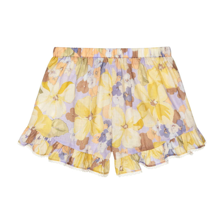 Lovely lilac purple shorts for girls by Australian brand Zimmermann, made in soft, semi-sheer cotton. Ideal for warmer days they are cool and lightweight and patterned with a colourful floral print in shades of yellow, purple and orange. There are ru