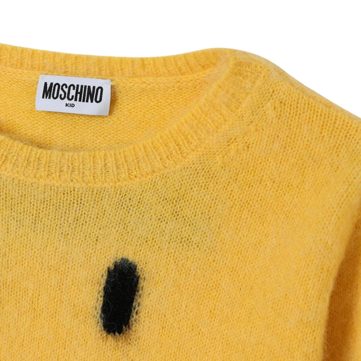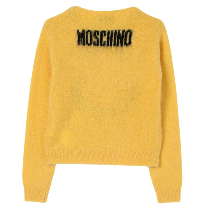 The Moschino girls yellow smiley knitted cardigan is a cheerful and cozy piece, featuring a bold smiley face design and soft wool blend. It is perfect for adding playful style and warmth to any outfit.