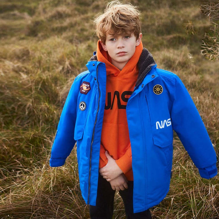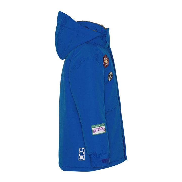 Blue winter jacket with Nasa patches and large pockets on the front. The jacket is part of Molo’s 'Everyday Exploration’. It's outerwear for everyday activities, which is practical but at the same time great looking. The jacket is, of course, als