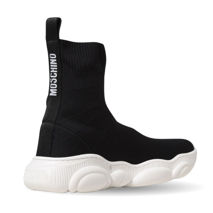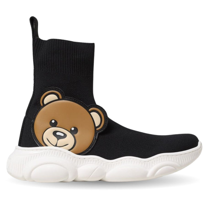 Playful black sock‑style sneakers featuring a stretchy, ankle‑high knit upper for a snug, comfy fit. A large teddy bear patch on the side and chunky white sculpted soles add a fun designer look, perfect for everyday casual outfits.