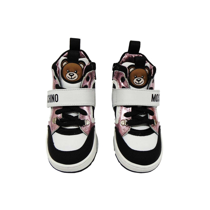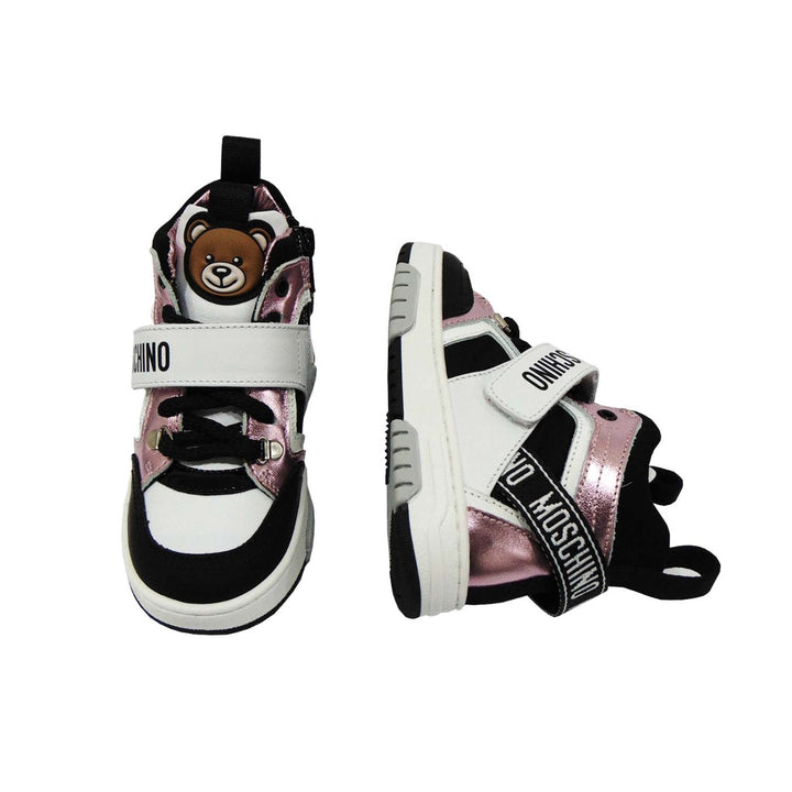 This super stylish pair of High-Top Color Block Moschino Sneakers is all that you need to make a stylish addition to your little one’s footwear collection. The high-top style, the perfect color combinations of pink, white and black, and the logo pr
