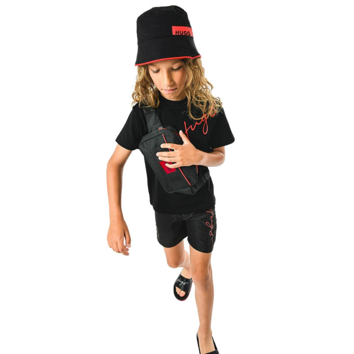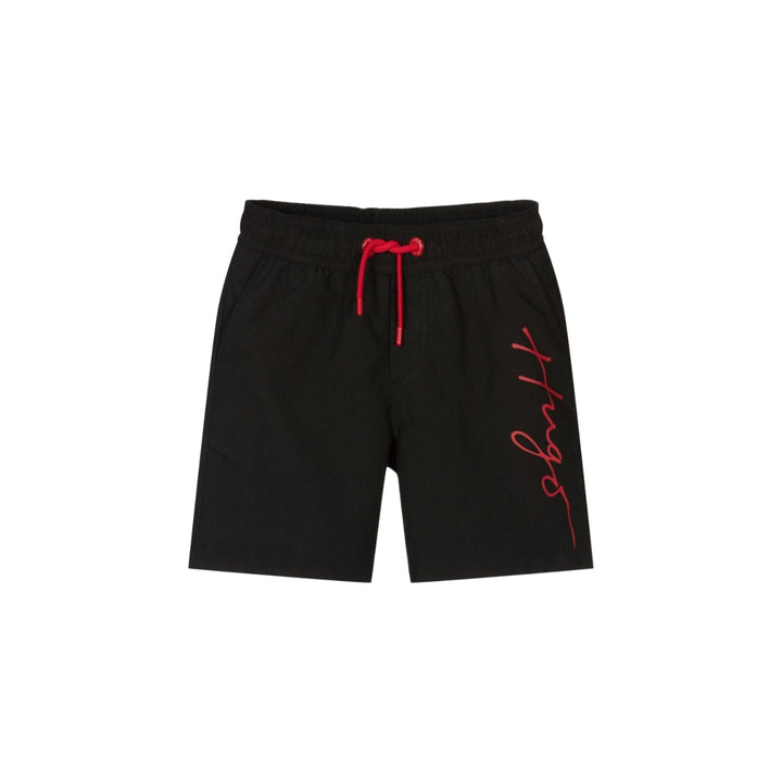 From luxury designer HUGO, a pair of sleek black swim shorts for boys. Soft and smooth, the fabric is printed with the labels cool script logo lettering on one side. Lined with soft mesh for comfort and breathability, they have handy front pockets and a waistband with a red branded drawstring.