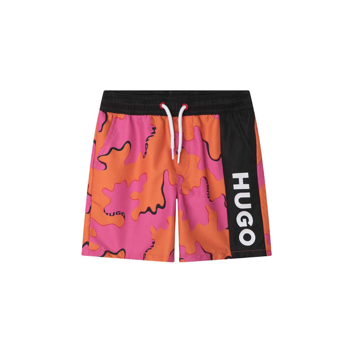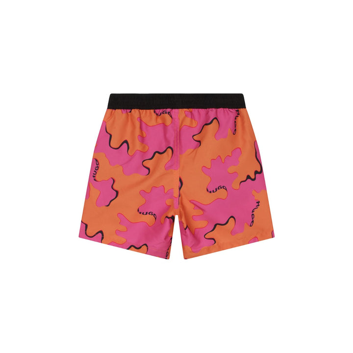 Boys Drawstring Print Swim Shorts by hugo.abstract-print drawstring swim shorts from HUGO KIDS featuring orange, pink, black, abstract pattern print, logo patch to the front, elasticated drawstring waistband, contrasting waistband, two diagonal pockets to the sides and mid-rise. Be mindful to try on swimwear over your own garments.