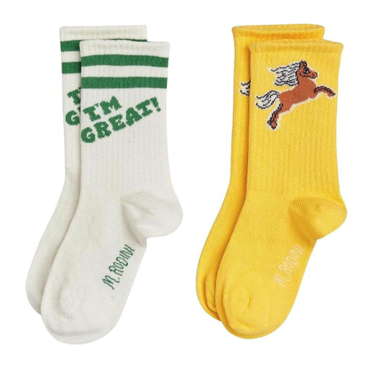 2-pack socks featuring Horse and “I am Great†artworks, made from a GOTS certified organic cotton and polyamide mix with stretch. The socks are soft to the touch, comfortably stretchy and have reinforced toe caps and heels. M.Rodini is printed un