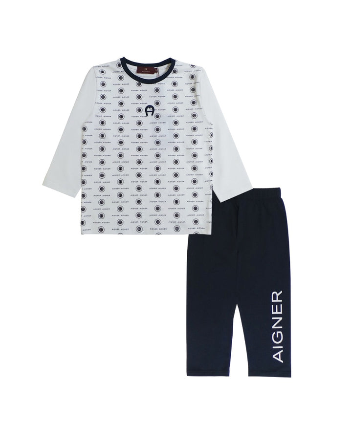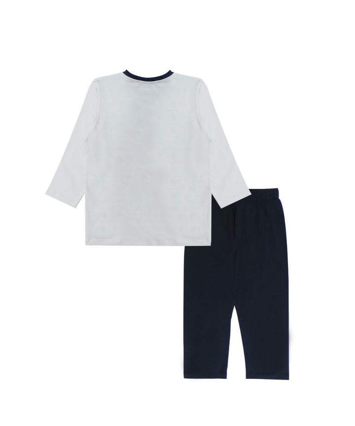 Featuring an ivory printed T shirt in cotton. It comes along with a pair of Navy Blue blue bottoms.