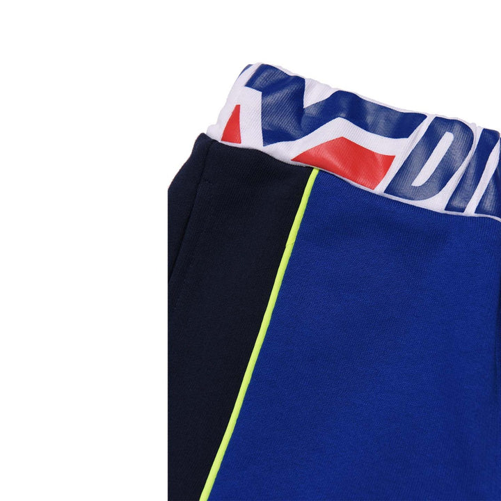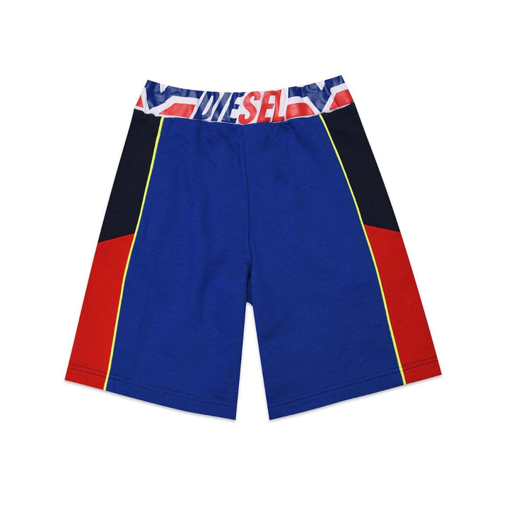 Boys blue, black and red colourblock shorts by Diesel, made in mid-weight cotton jersey. Forming part of the designer's sports capsule, they have side pockets and light reflective grey piped trims. There are red and blue logo prints on the elasticated white waistband.